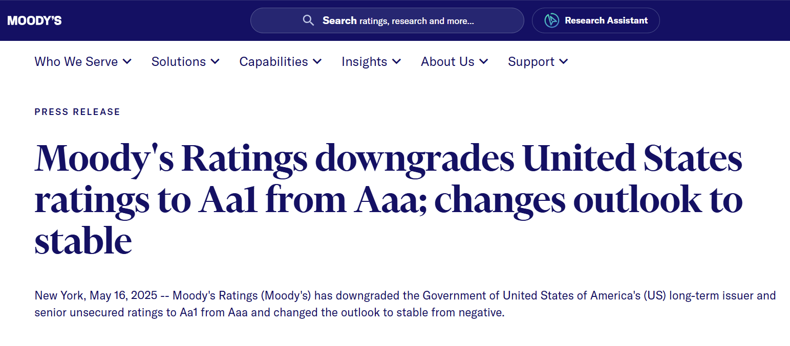 5 月 16 日,穆迪评级公司(Moody’s Ratings)下调了美国的信用评级,从最高级别 Aaa下调至 Aa1,并将评级展望从“负面”调整为“稳定”。此前,惠誉评级(Fitch Ratings)和标普全球评级(S&P Global Ratings)已将美国评级调至 Aaa 以下,穆迪的这一决定这意味着全球最大经济体已被三大评级机构全部降级。这一具有标志性的决定令外界对美国作为全球最优质主权借款国的地位产生疑问。