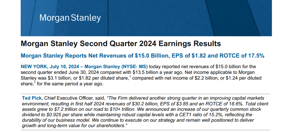 大摩首席执行官 Ted Pick 表示:“在资本市场环境不断改善的情况下,公司又取得了强劲的季度业绩。我们将继续执行我们的战略,并保持为股东实现增长和长期价值的良好状态。”