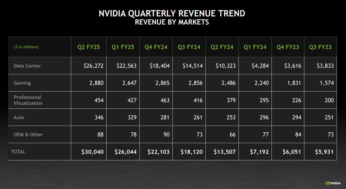 - 二季度数据中心营收 263 亿美元,同比增长 154%,高于预期的 251 亿美元,前一季度同比增长 427%;