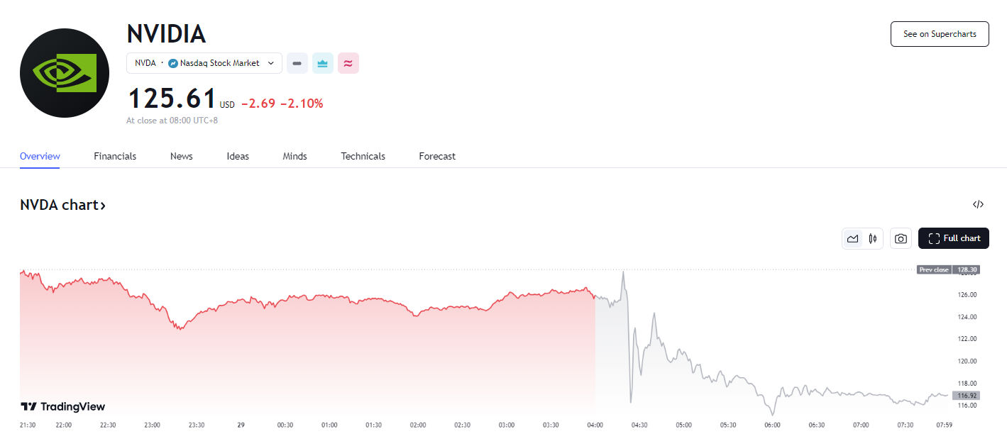 财报公布后,周三收跌 2.1% 的英伟达股价盘后巨震,先涨超 2%,后跳水转跌,盘后跌幅曾超过 7%,后一度收窄过半跌幅、跌不足 2%。此后跌幅再度扩大,曾跌超 8%。受英伟达盘后大跌影响,纳斯达克 100 股指期货盘后跌超 1%。