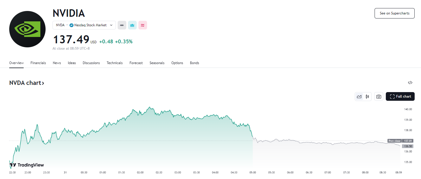 30 日,英伟达逆势走高,收涨 0.35%,报 137.49 美元,总市值达到 3.37 万亿美元,高于微软的 3.2 万亿美元。今年以来,英伟达股价涨幅达到179.20%。
