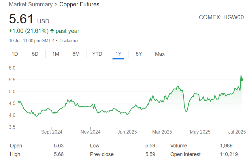 7 月 10 日,美国总统特朗普确认自 2025 年 8 月 1 日起,对全球铜进口征收 50% 的关税。铜价继昨日飙升 13% 后,再次上涨 2.6%,带动矿业股在盘前纷纷走高。美国最大铜矿商 Freeport-McMoRan(FCX)股价上涨 2.6%,必和必拓(BHP)上涨 3%,力拓(RIO)及 Southern Copper(SCCO)等也同步攀升。