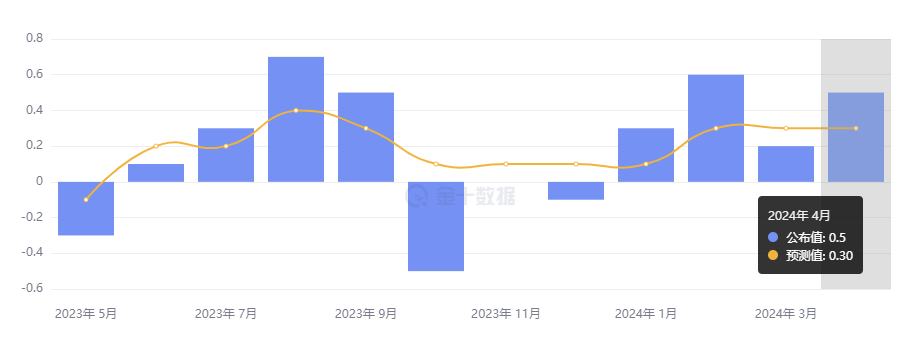剔除波动幅度较大的食品和能源的 4 月核心 PPI 同比增 2.4%,略高于预期值 2.3%,与前值一致;核心 PPI 环比则由 3 月的 0.2% 增长至 0.5%,高于预期的 0.2%。