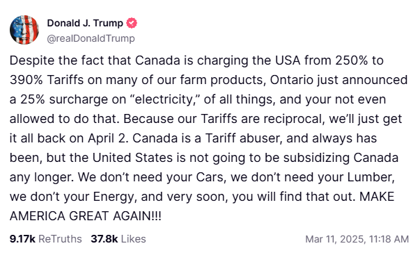 特朗普表示,此次加征关税是对加拿大安大略省政府决定对出口至美国的电力加征 25% 税收的回应。此前 10 日,加拿大经济第一大省——安大略省政府宣布,即日起开始对输美电力征收 25% 的关税,作为对美国总统特朗普对加拿大商品征收关税的报复措施的一部分。鉴于加拿大对向美国三个州出口的所有电力征收 25% 的附加费,特朗普称他将很快宣布受威胁地区进入国家电力紧急状态。