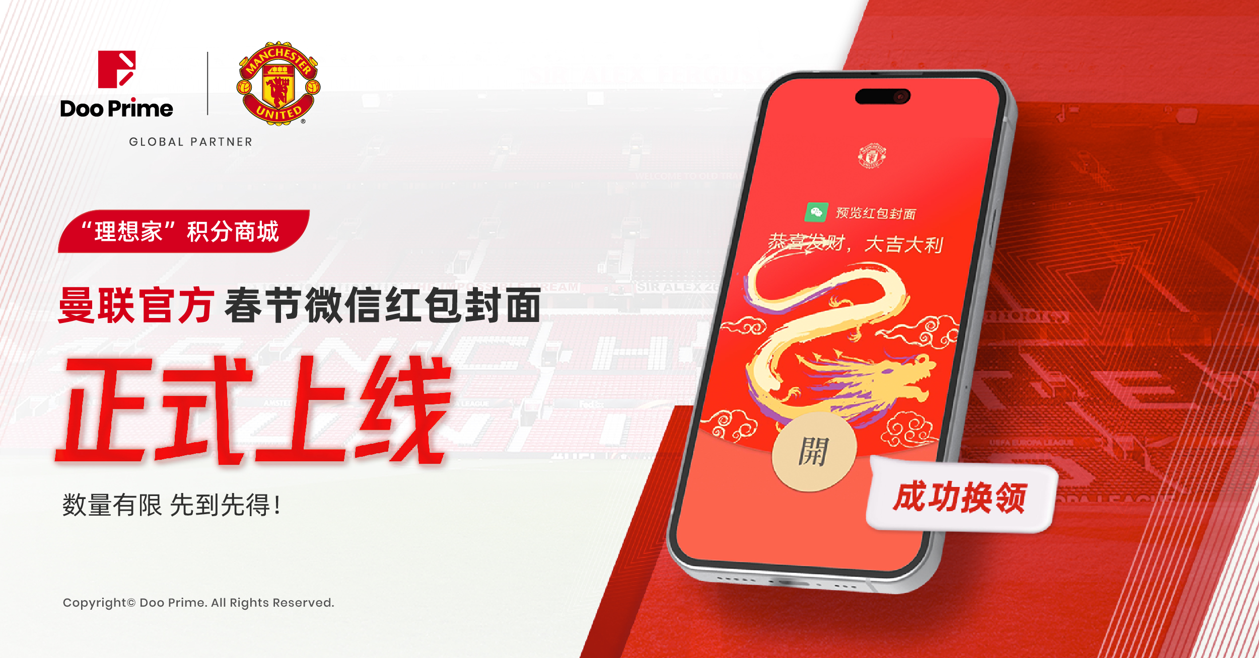 本次微信红包封数量有限,免费兑换,先到先得!抢先体验曼联 2024 新春限定微信红包封面,尽情感受新春的喜庆氛围。Doo Prime 期待与您共同度过这个充满欢笑和祝福的龙年新年!