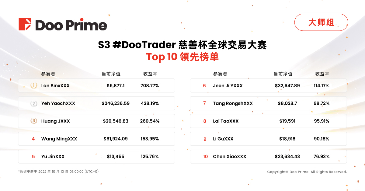 S3 #DooTrader 慈善杯全球交易大赛奖池累计超过 1,000,000 元,分为两轮赛制,每轮赛事两组各颁发 10 个奖项, 获奖机会更多,奖金更多!参赛者每交易一手,Doo Prime 将捐赠 10 倍常规善款—即 0.1 美金,支持全球贫困儿童的教育工作。