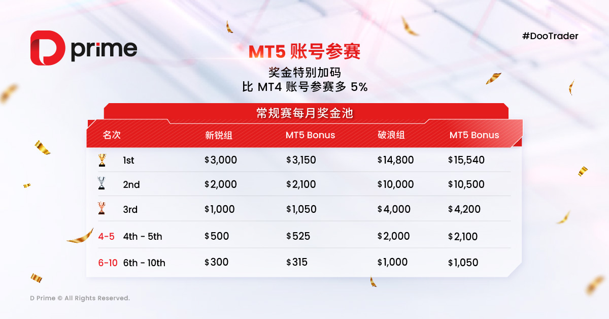凡使用 MT5 账号参赛的得奖选手,更可获得基础奖金 +5% 的额外奖金!