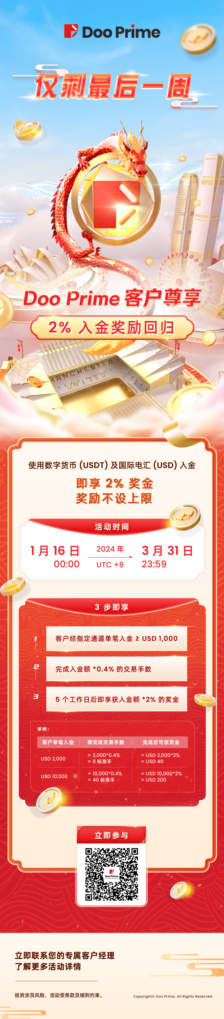 在大家的热情参与下,Doo Prime 客户尊享 2% 入金回馈奖励活动进入倒计时!只需在 3 月 24 日前入金并在 3 月 31 日前交易,即可享受 2% 回赠奖励,上不封顶!Doo Prime 诚邀各位投资者抓紧时机,入金交易并领取更多的回赠奖金! Doo Prime 将助您在 2024 年第一季度交易满盈、收获丰厚!