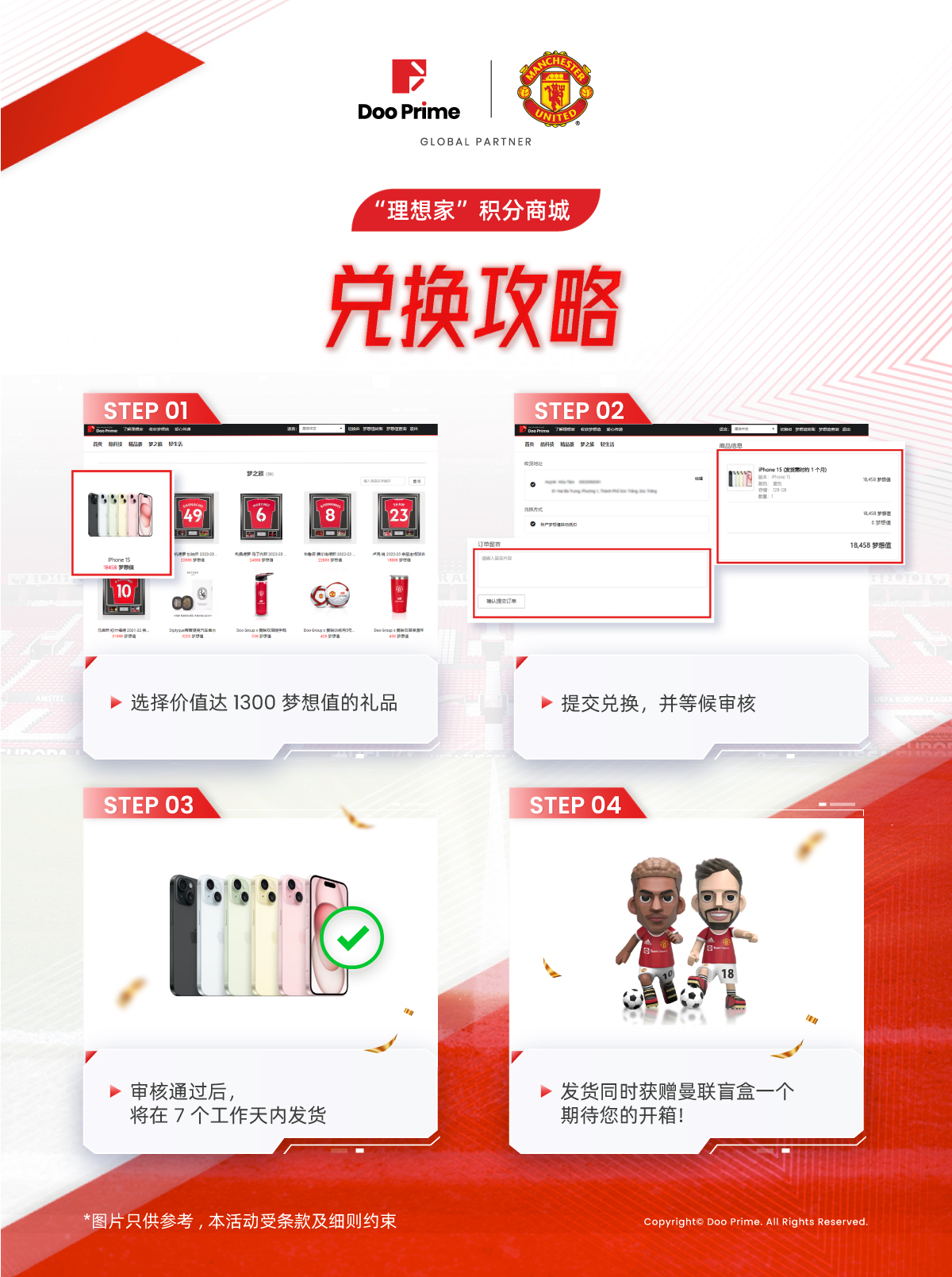 您只需在 2024 年 6 月 20 日至 6 月 30 日(UTC+8)活动期间,登录 Doo Prime 积分商城,单次兑换实体礼品满 1,300 积分,即可获赠曼联盲盒公仔一个。活动不设兑换上限,每一份符合条件的订单都可参与。每次兑换都会给您带来不一样的惊喜!感谢您一同见证了 Doo Prime 与曼联彼此的成长与辉煌。
