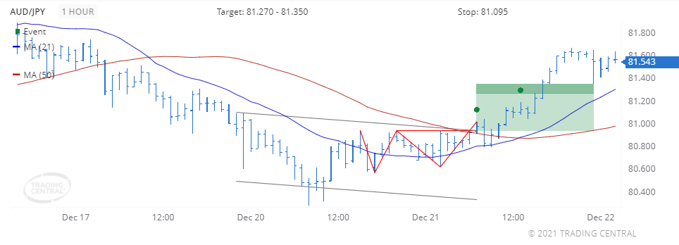 We found a pattern called Double Bottom on 2021 Dec 21 at 07:00 GMT on a 1 hour chart, providing a target price for up to 48 hours in the range of 81.270 to 81.350.