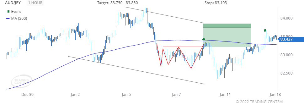We found a pattern called Triple Bottom on 2022 Jan 10 at 03:00 GMT on a 1 hour chart, providing a target price for up to 2 weeks in the range of 83.750 to 83.850.