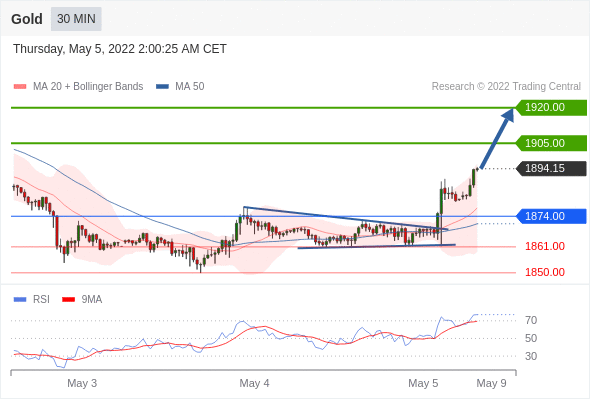 Long positions above 1874.00 with targets at 1905.00 & 1920.00 in extension.