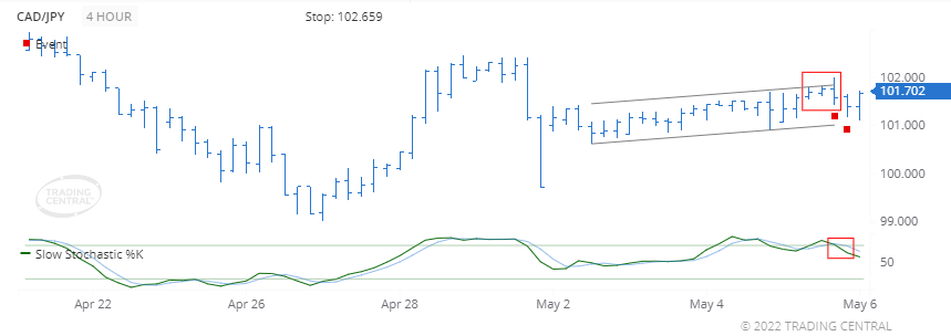 A bearish event triggered for Slow Stochastics on 2022 May 05 at 21:00 GMT when the %K line crossed below the %D line. The close prices are trading closer to the lower end of the recent high-low price range, which is associated with price decreases.