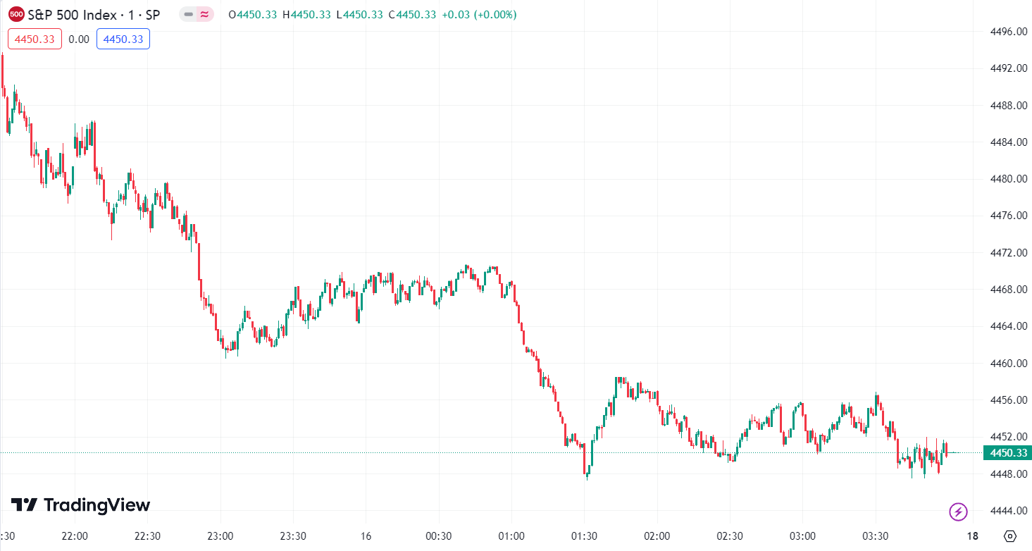 - S&P 500 Index dropped by 54.78 points, a decline of 1.22%, closing at 4,450.32 points.