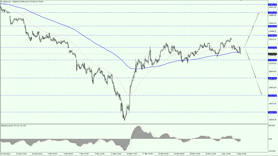 HK50 Index focuses on the 22127-line today. If HK50 can run stably below the 22127-line, then pay attention to the support strength of 21450 and 20467. If HK50 runs above the 22127-line, then pay attention to the suppression strength of 22785 and 23294.