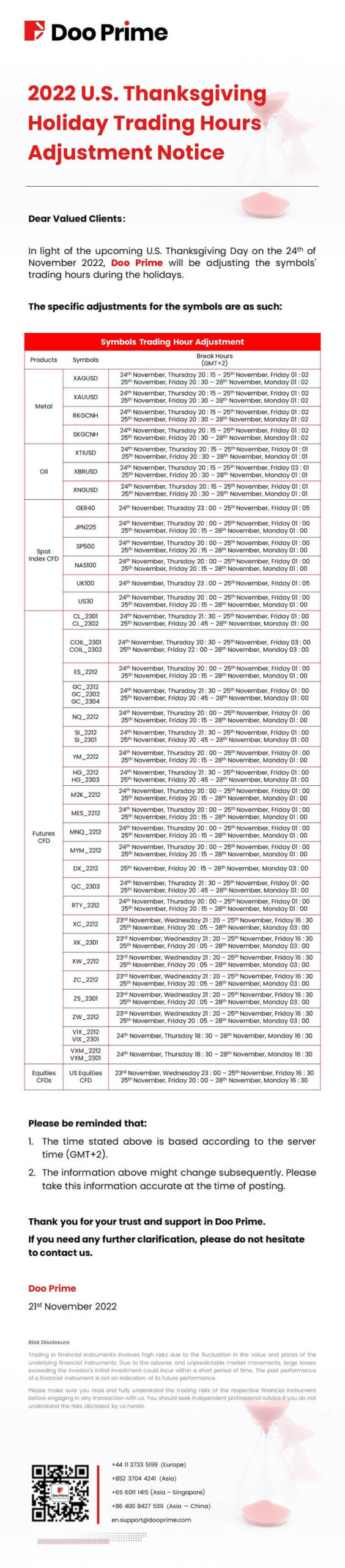 2022-11-21 | Holiday Hours , Trading Hours Adjustment