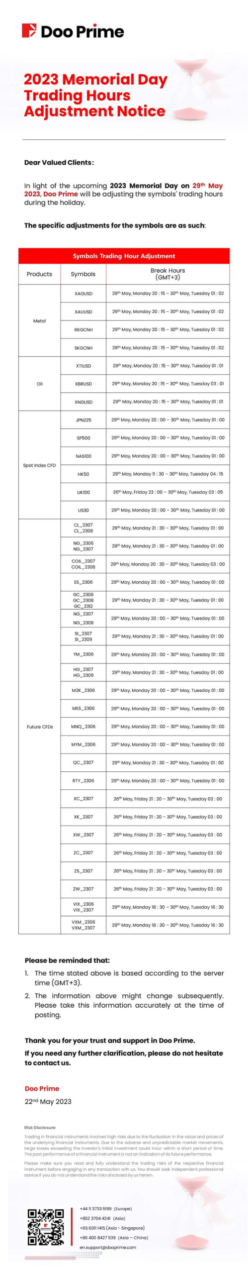 2023-05-22 | Holiday Hours , Trading Hours Adjustment