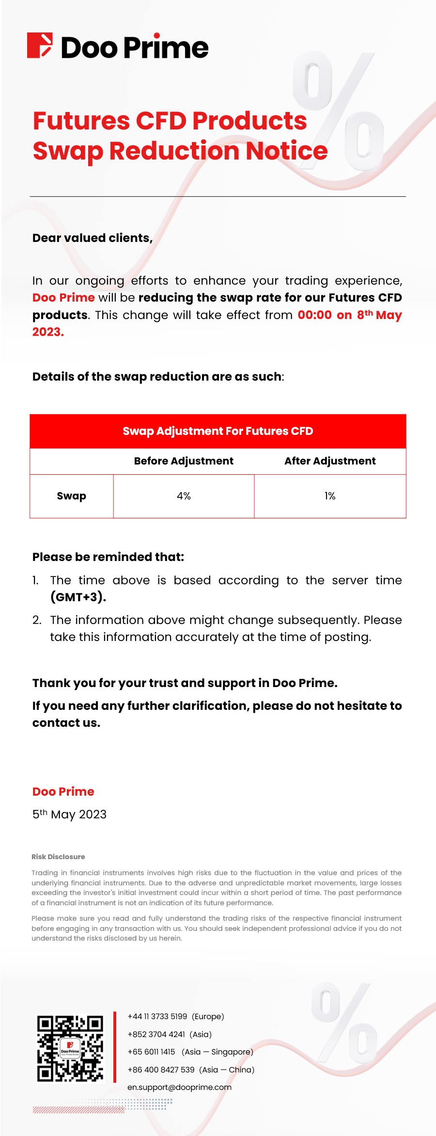 Doo Prime Futures CFD Products Swap Reduction Notice