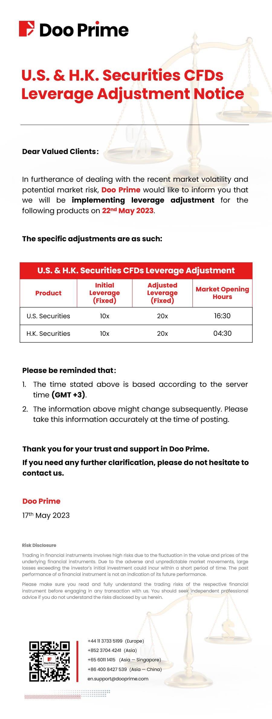 Doo Prime U.S. & H.K. Securities CFDs Leverage Adjustment Notice