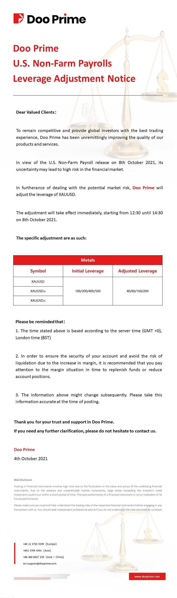 2021-10-04 | Leverage Adjustment Notice , Non-Farm Payroll , US Non-Farm Payrolls Leverage Adjustment Notice