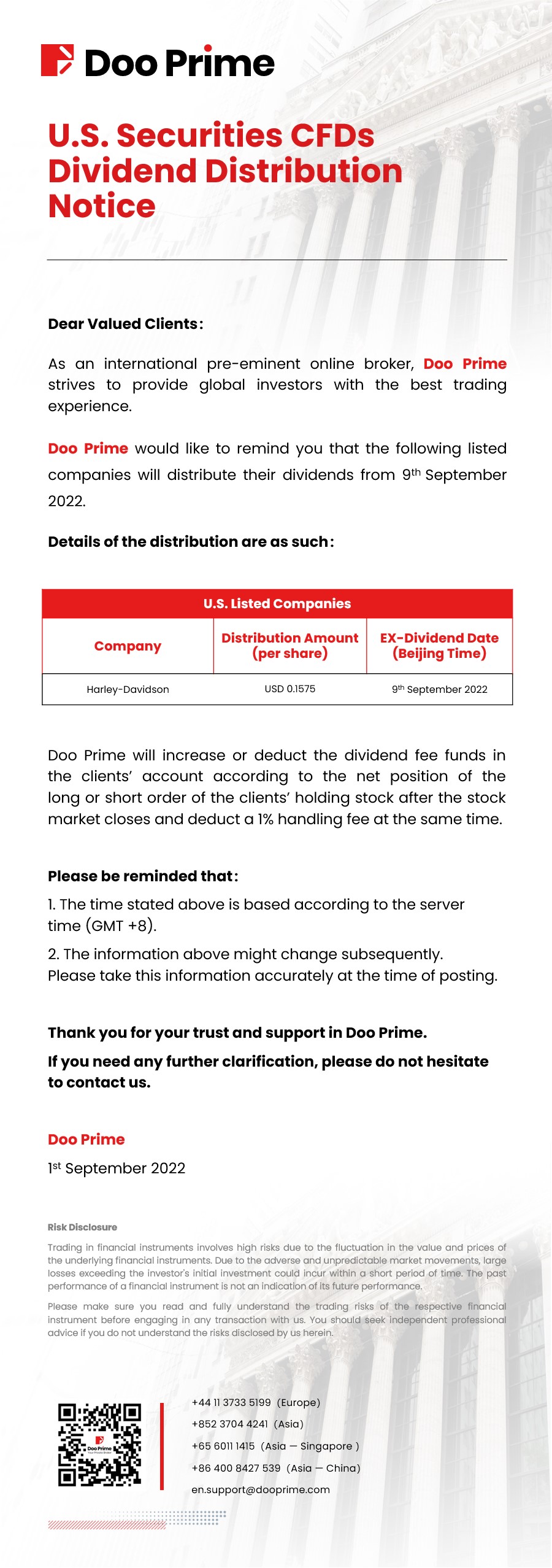 Doo Prime U.S. Securities CFDs Dividend Distribution Notice