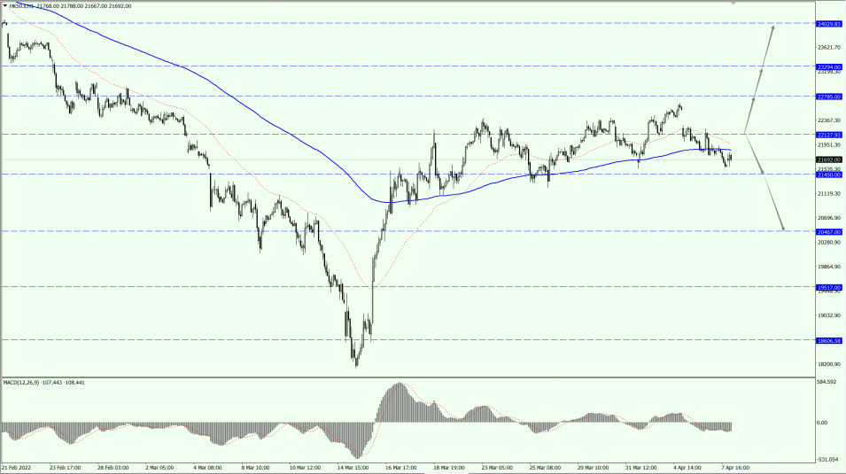 HK50 Index focuses on the 22127-line today. If HK50 can run stably below the 22127-line, then pay attention to the support strength of 21450 and 20467. If HK50 runs above the 22127-line, then pay attention to the suppression strength of 22785 and 23294.