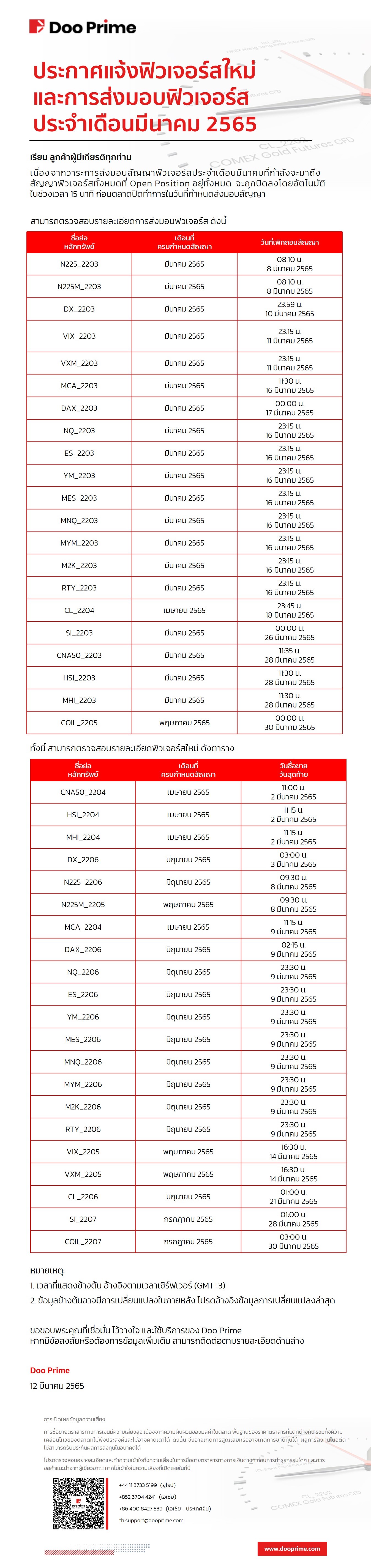 Doo Prime ประกาศแจ้งฟิวเจอร์สใหม่และการส่งมอบฟิวเจอร์สประจำเดือนมีนาคม 2565
