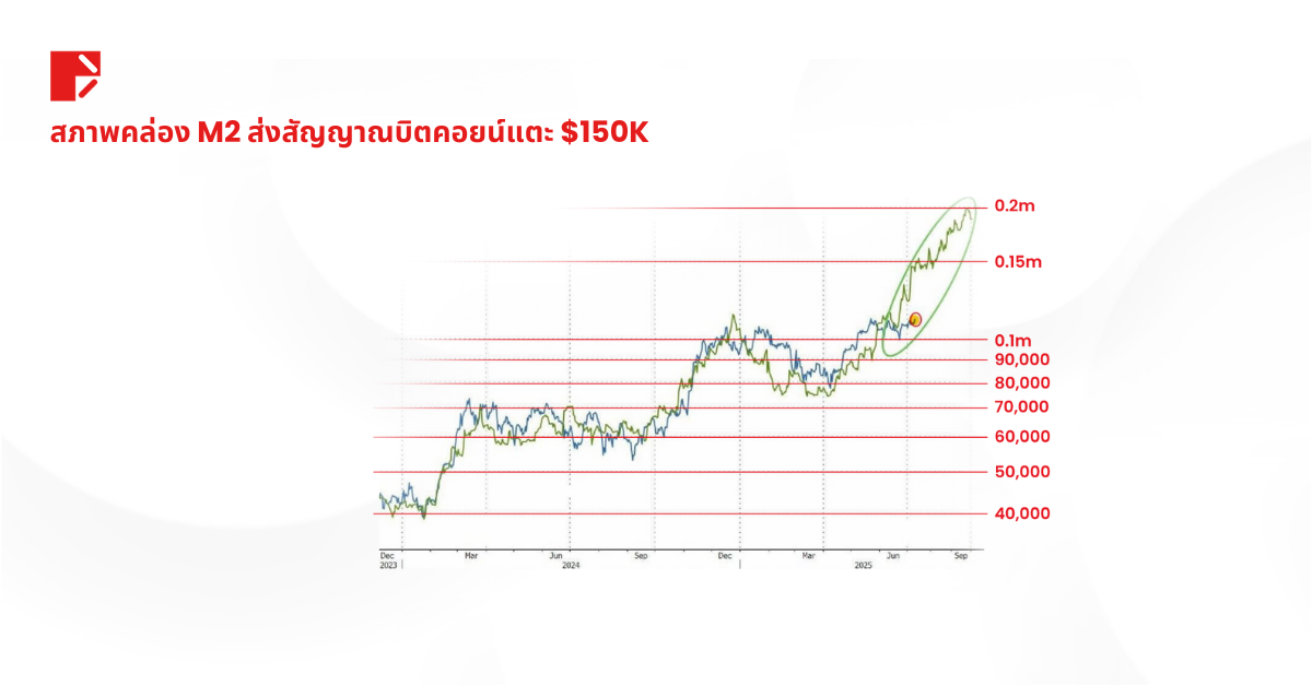 การเคลื่อนไหวครั้งใหญ่ของบิตคอยน์มักจะสอดคล้องกับแนวโน้มสภาพคล่องแบบง่ายๆ เมื่อธนาคารกลางอัดฉีดเงินเข้าสู่ระบบ หรือปริมาณเงิน M2 ทั่วโลกเพิ่มขึ้น สินทรัพย์เสี่ยงอย่างบิตคอยน์ก็มักจะพุ่งขึ้น มันไม่ใช่เวทมนตร์อะไรเลย แค่สภาพคล่องที่มากขึ้นหมายถึงเชื้อเพลิงที่มากขึ้นสำหรับทุกอย่าง ตั้งแต่หุ้น ทองคำ ไปจนถึงคริปโต