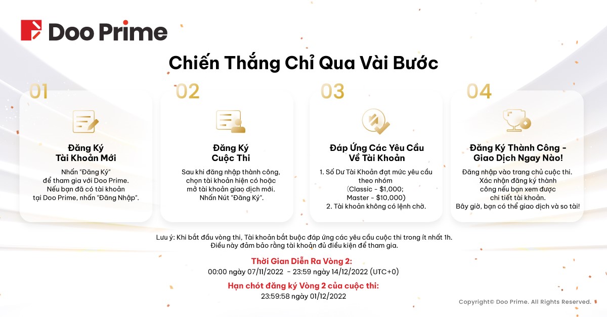 Vòng đầu tiên của Cuộc Thi Tranh Cúp Giao Dịch Toàn Cầu #DooTrader mùa 3 đã kết thúc thành công tốt đẹp. Vòng 2 sẽ chính thức khởi động vào ngay sau đó – tức ngày 7 tháng 11 năm 2022. Bất kể bạn là thí sinh mới hay đã là nhà giao dịch tham gia vòng đầu tiên, Doo Prime đều hoan nghênh bạn đến với Vòng 2 của DooTrader. Với tổng giá trị giải thưởng 159,000 USD, chúng tôi rất mong sẽ được chứng kiến những màn thi đấu đỉnh cao từ các người chơi.
