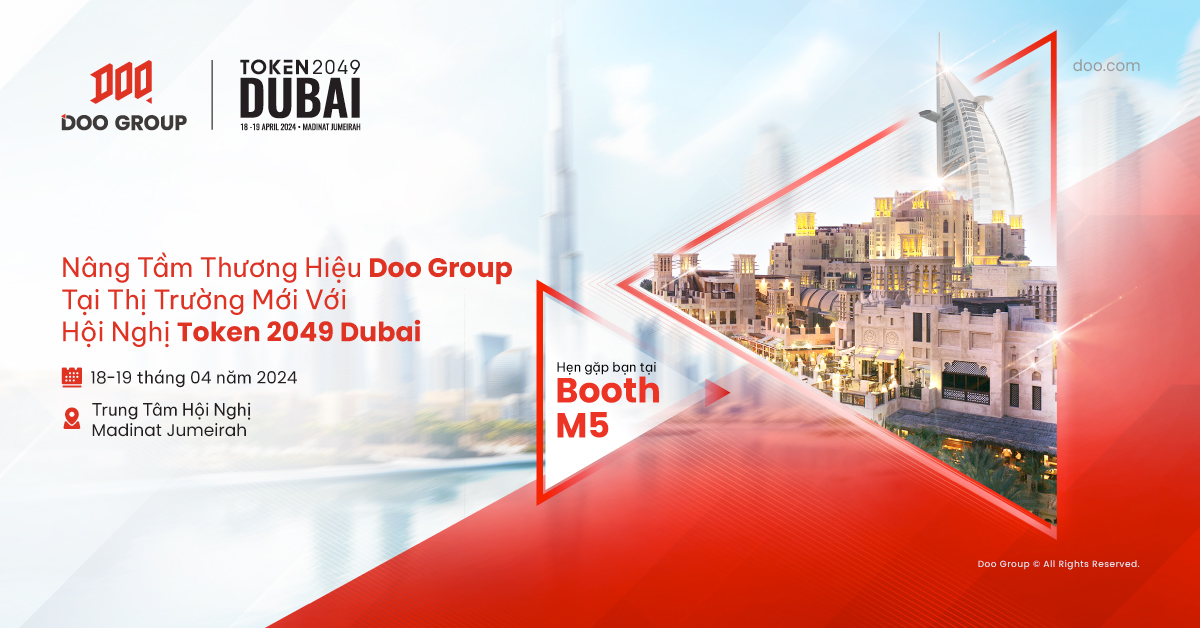 Doo Group xin hân hoan thông báo sự hiện diện của chúng tôi trong vai trò là nhà tài trợ bạc tại Hội Nghị Token 2049 Dubai. Sự kiện dự kiến được tổ chức từ ngày 18 tháng 4 năm 2024 đến ngày 19 tháng 4 năm 2024 tại Trung Tâm Hội Nghị Madinat Jumeirah.