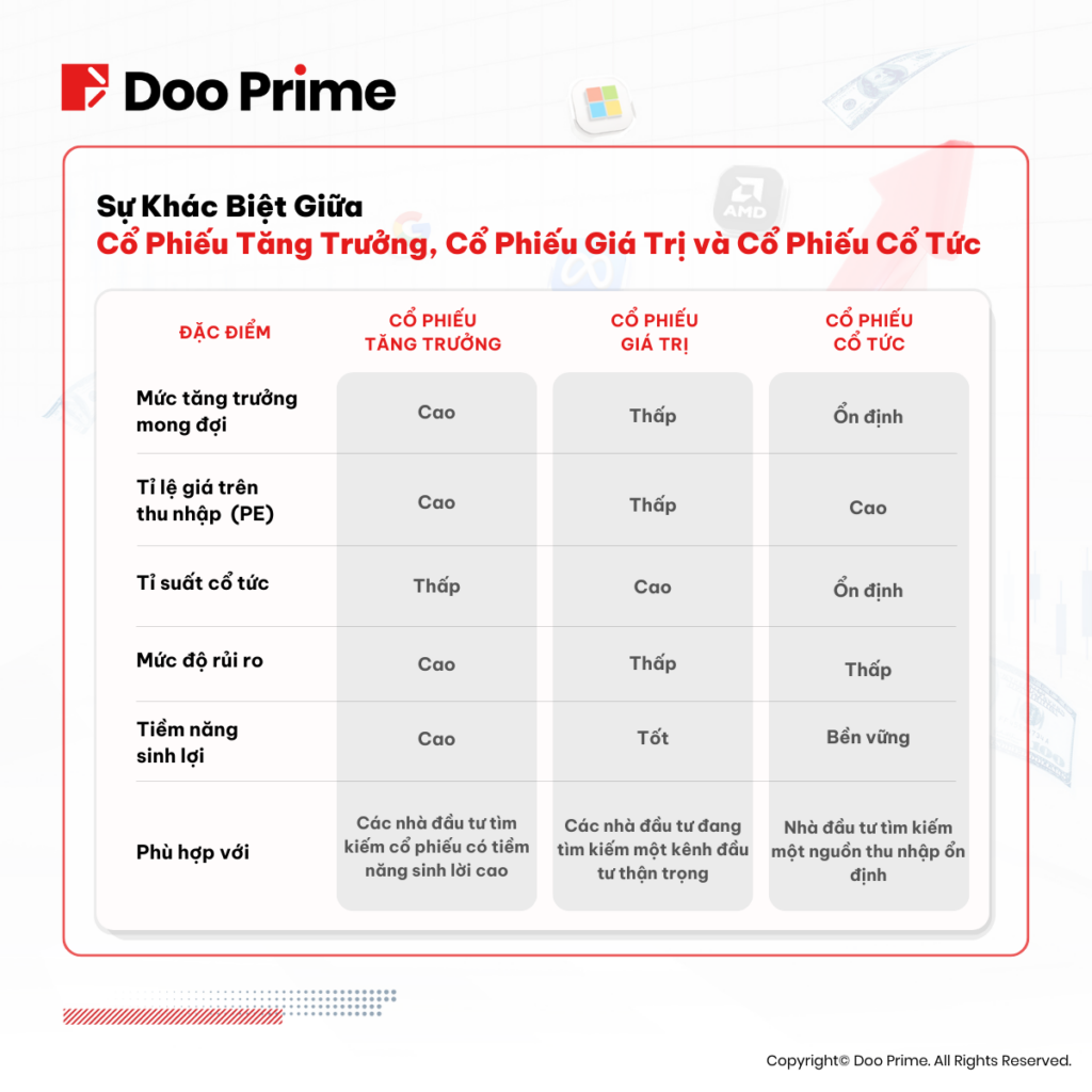 Việc chọn ra sản phẩm để đầu tư phải phù hợp với khẩu vị rủi ro và mục tiêu đầu tư của từng người. Nếu bạn là nhà đầu tư nhắm đến những cổ phiếu có tiềm năng sinh lợi lớn, thì cổ phiếu tăng trưởng đích thị là lựa chọn phù hợp cho bạn. Mặt khác, nếu bạn thích tiếp cận đầu tư thận trọng hơn, ổn định hơn thì nên xem xét các loại cổ phiếu như cổ phiếu giá trị hoặc cổ phiếu cổ tức.