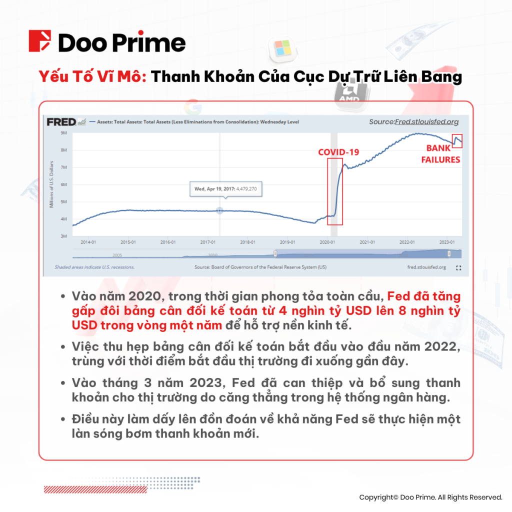 Một tín hiệu tích cực khác dành cho các cổ phiếu tăng trưởng chính là động thái của Cục Dự Trữ Liên Bang Mỹ (FED). Bất chấp chính sách thắt chăt hiện tại, FED gần đây đã bơm một đợt thanh khoản mới vào thị trường sau ba vụ phá sản của các ngân hàng của Mỹ là: First Republic Bank, Signature Bank và Silicon Valley Bank.